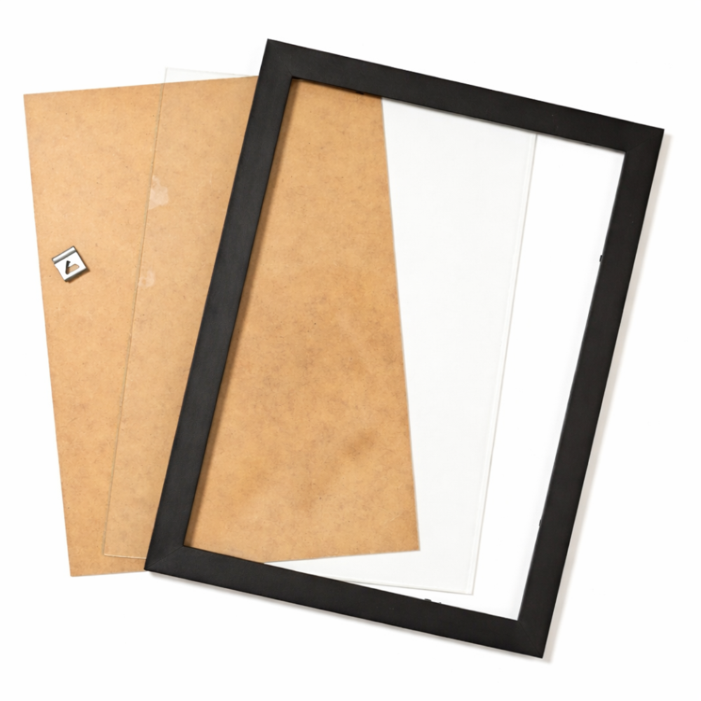 Quadro com moldura elegante, composto por vidro incolor, fundo em MDF resistente e pendurador móvel, garantindo praticidade na instalação. Ideal para exposição de artes, certificados, fotos ou comunicações, com acabamento moderno e sofisticado.