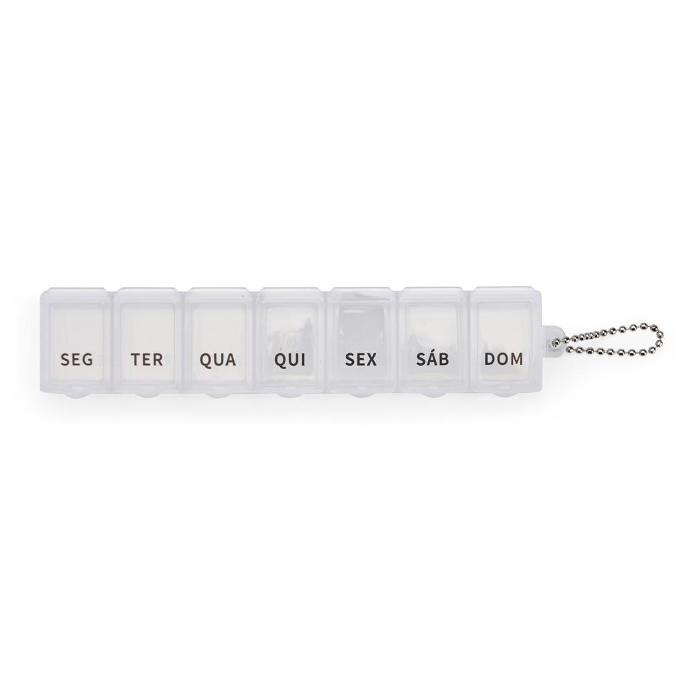 Porta-comprimidos em plástico com sete divisórias com capacidade de até 10ml. Cada compartimento é identificado com a abreviação de um dia da semana. Acompanha uma corrente de bolinhas para encaixe no organizador.