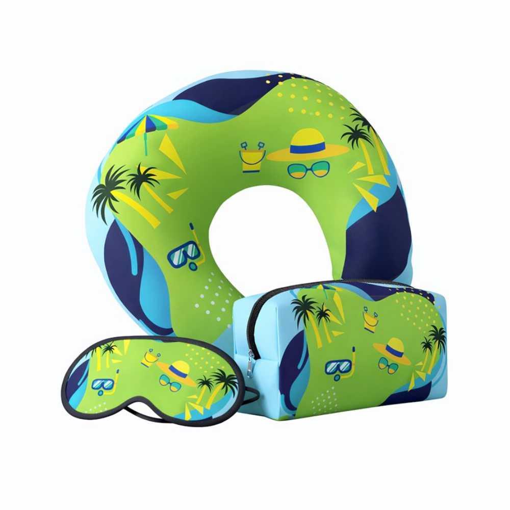 Kit viagem contendo: almofada para pescoço em helanca, máscara em isoflex e necessaire em neoprene.
