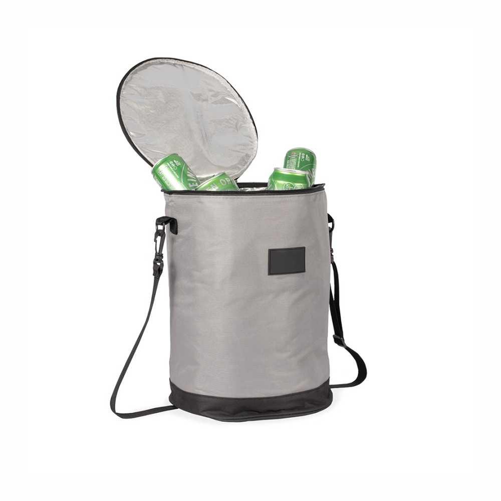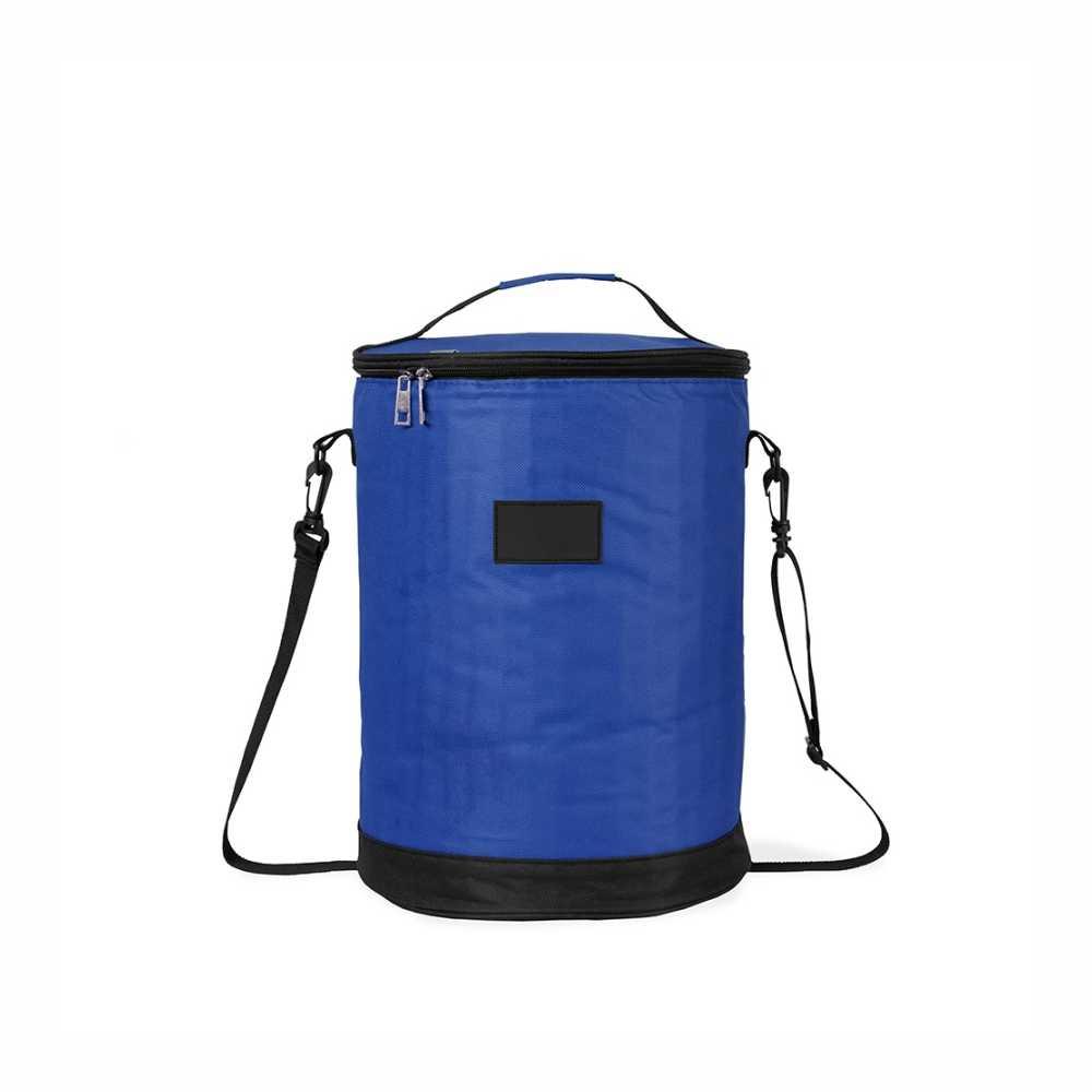 Bolsa térmica em formato cilíndrico com capacidade de até 18 litros. Confeccionada em Oxford, conta com revestimento térmico em folha de alumínio que ajuda a manter a temperatura de alimentos e bebidas conservados por mais tempo em seu amplo compartimento interno. Possui alça de ombro ajustável e removível, além de outra alça fixa localizada na tampa.
