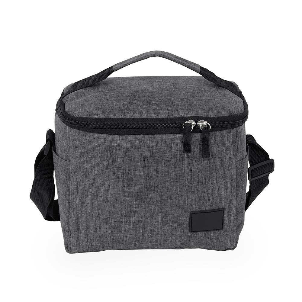 Bolsa térmica confeccionada em Oxford 300D resistente à água com capacidade máxima de 6 litros, fechamento em zíper e plaquinha personalizável em plástico costurada na parte frontal. Possui revestimento térmico antivazamento em PEVA, dois bolsos laterais, alça de mão superior e alça transversal ajustável.