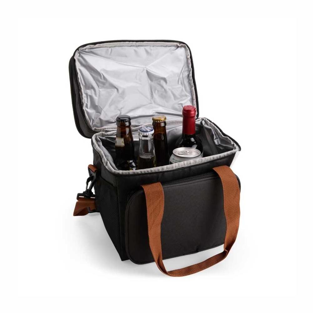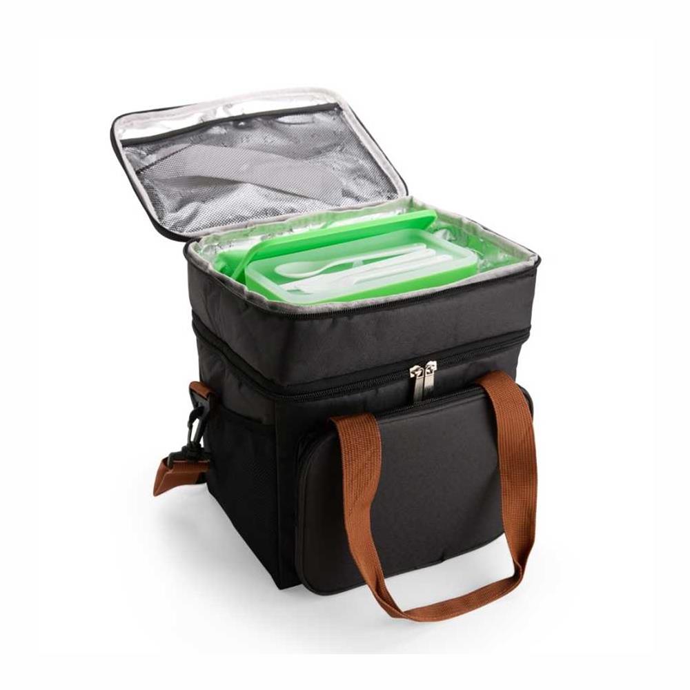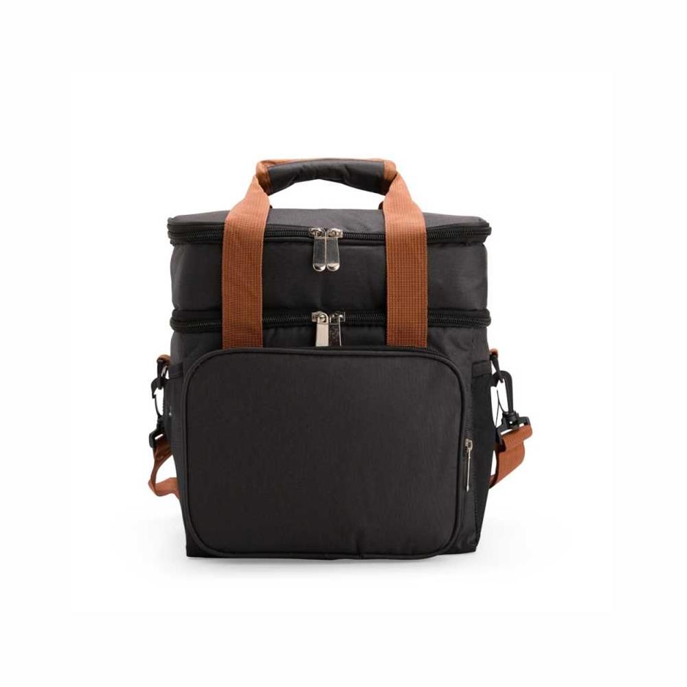 Bolsa térmica dupla em poliéster 300D resistente à água e capacidade total de 12 litros. Possui dois compartimentos térmicos: um inferior, com revestimento em PEVA que comporta até 9 litros e outro, em alumínio, com espaço para até 3 litros.. Conta ainda com bolso frontal, bolsos laterais em tela, alças de mão com suporte de juntura e alça transversal regulável e removível.