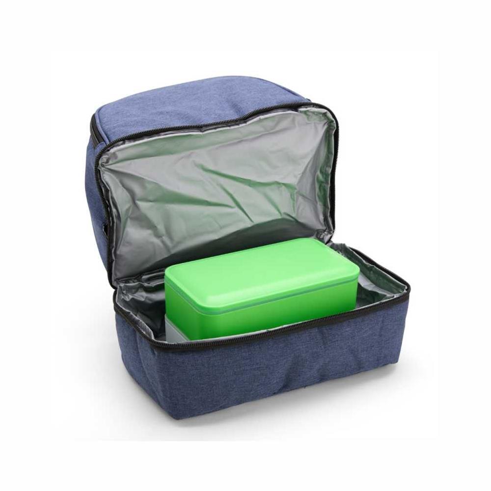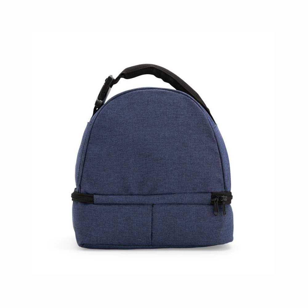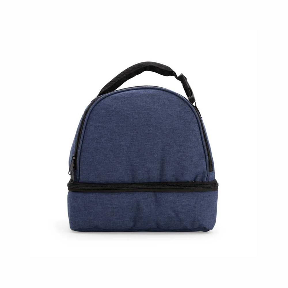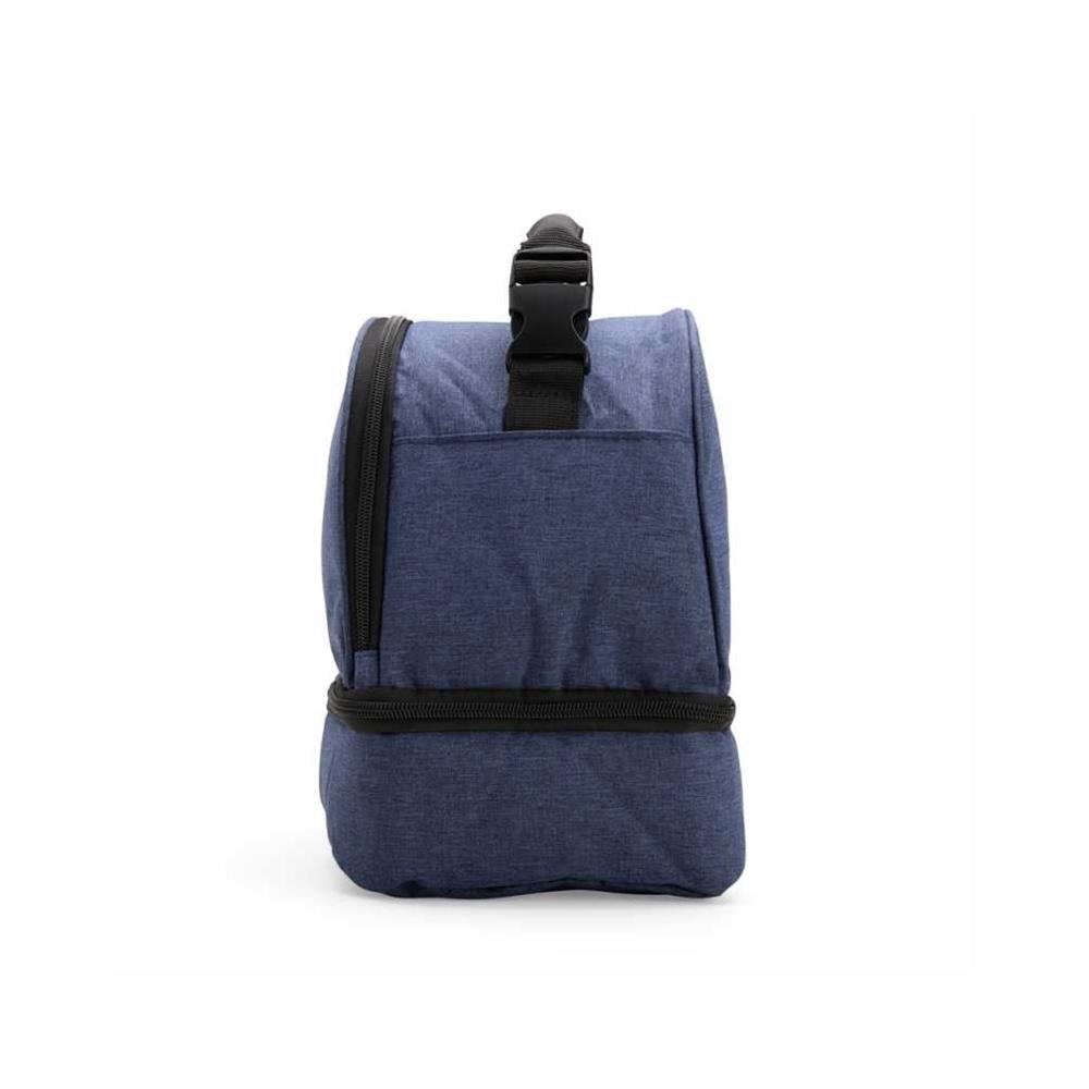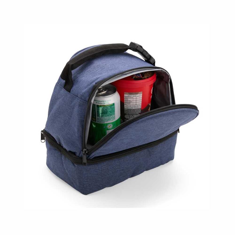 Bolsa térmica dupla feita em poliéster 300D resistente à água, com capacidade total de 12 litros divididos em dois compartimentos revestidos internamente em PEVA: o superior comporta até 5 litros e o inferior, até 3 litros. Possui alça superior com engate em plástico