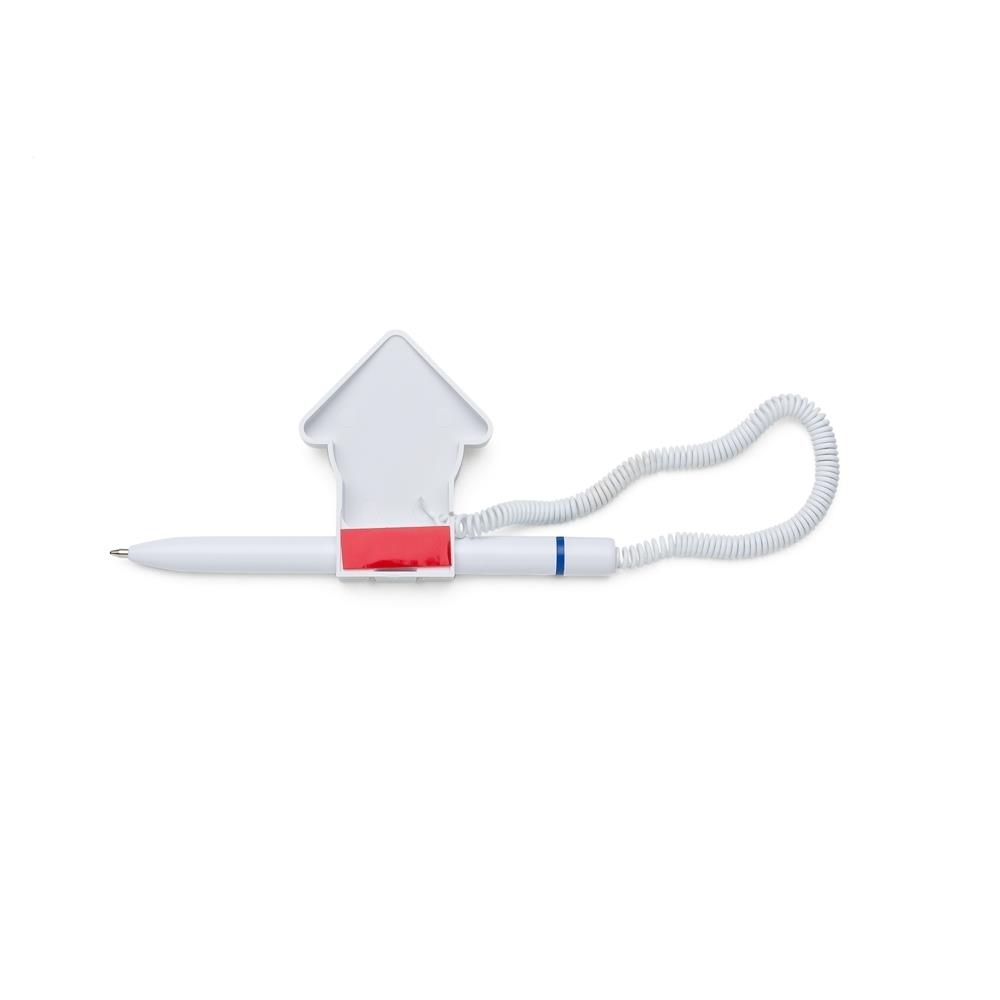 Caneta balcão plástica com suporte e adesivo auto colante. Carga esferográfica azul.