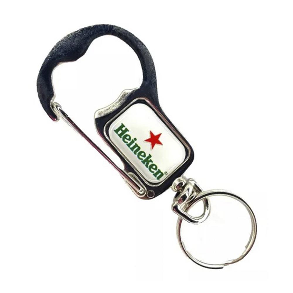 Chaveiro de metal modelo mosquetão com formato de abridor de garrafas.