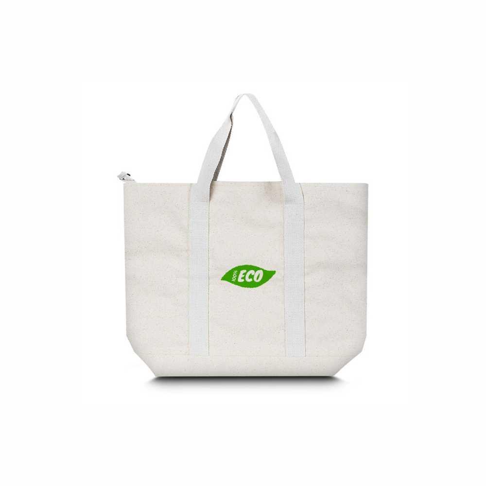 Ecobag em algodão cru com alças em algodão costurada por fora. Modelo com fundo e Ziper para fechamento