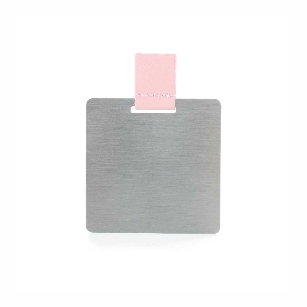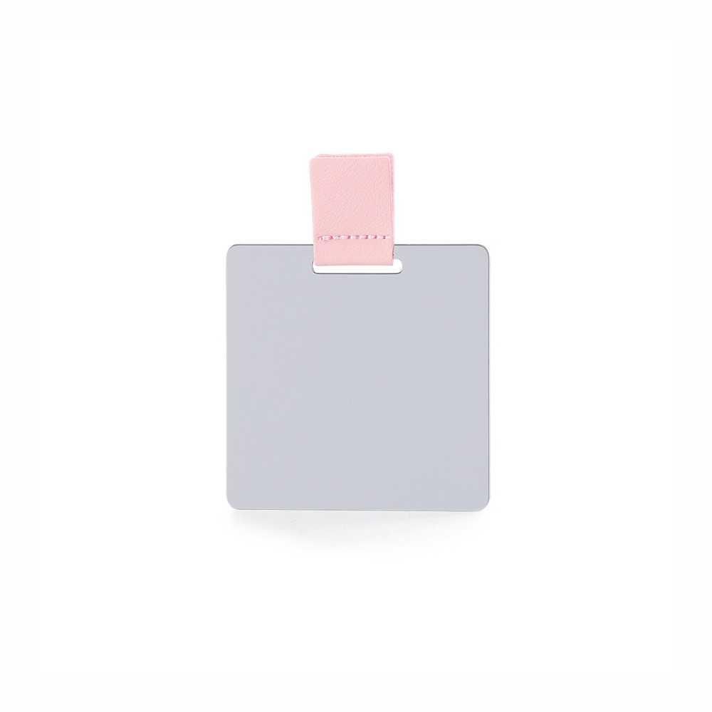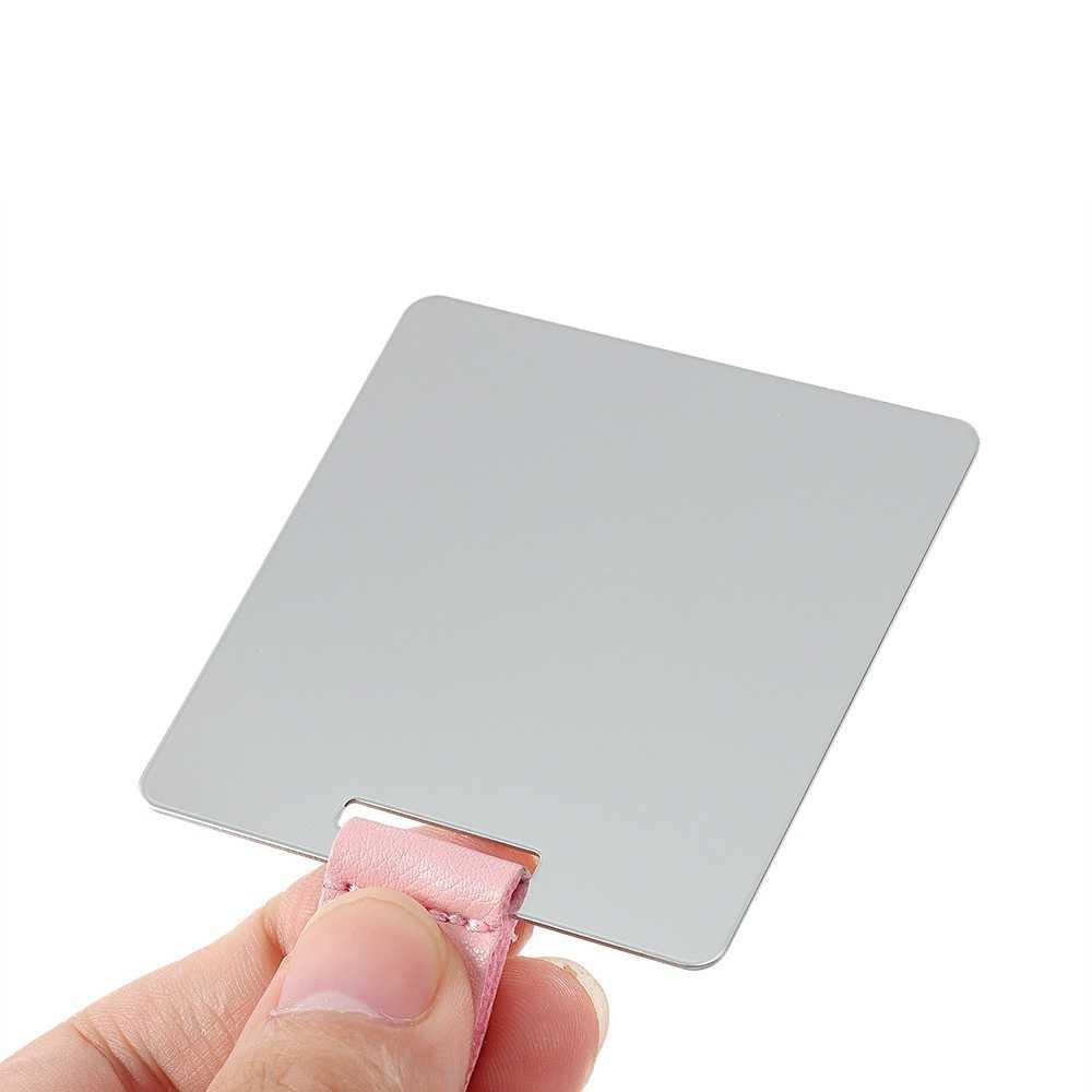 Espelho inquebrável de aço inoxidável ultra fino com verso escovado e alça em couro sintético. Acompanha estojo de couro sintético.