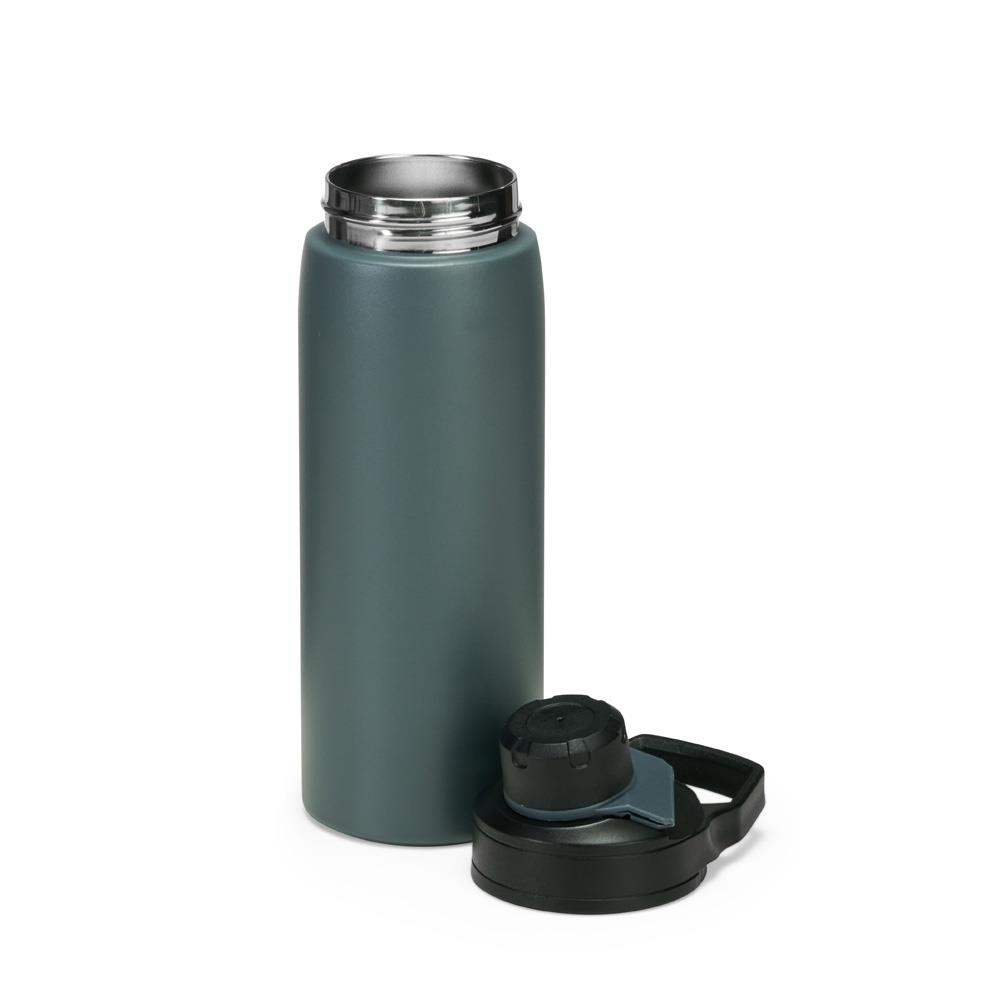 Garrafa térmica feita em inox com estrutura em parede dupla, vedação a vácuo e capacidade máxima de 600ml, ideal para manter a temperatura de líquidos por mais tempo. Possui tampa rosqueável em plástico resistente com protetor de bocal e alça fixa, em formato retangular, para transporte.