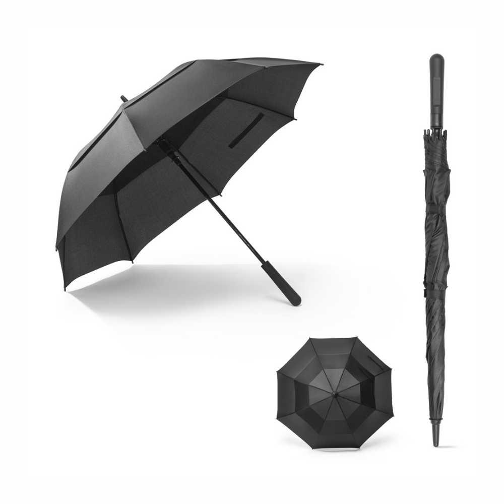 Guarda-chuva de 27.5"" em poliéster 100% reciclado (rPET) pongee 190T, com pega em ABS 35% reciclado, aberturas e haste em fibra de vidro. O guarda-chuva tem abertura automática e é à prova de vento. Fornecido numa bolsa individual.