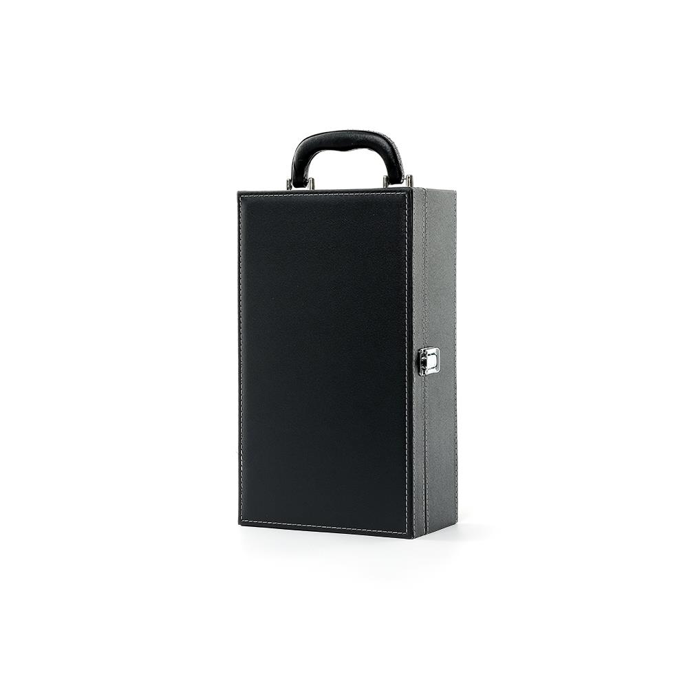 Kit vinho 4 Peças em maleta de couro sintético com duas repartições para garrafas. Contém saca-rolhas metálico, bico condutor com tampa, cortador de lacre e wine collar. Maleta com alça e trava de segurança, área interna revestida de veludo com suporte em couro sintético e velcro em cada repartição para fixação das garrafas.