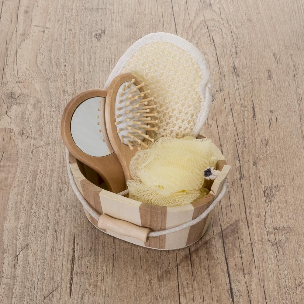 Kit banho de madeira com 5 peças. Possui: espelho, escova de cabelo, esponja de banho, bucha de banho e massageador. Acompanha balde com alça e pegador de madeira.