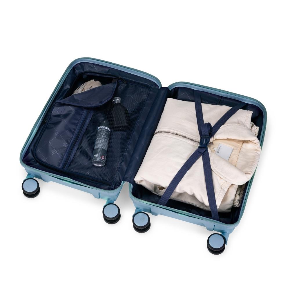 Mala de viagem em plástico resistente, fechamento em zíper e capacidade para até 30 litros. Possui dimensões compatíveis com o padrão da ANAC, compartimento interno com fechamento em zíper e bolso superior em tela de malha, além de cinta compressora no lado oposto para organização de objetos. Conta ainda com alça de mão, quatro rodinhas com giro em 360 graus, puxador com ajuste de nível e alça plástica, além de cadeado numérico TSA. Acompanha placa em metal para personalização.