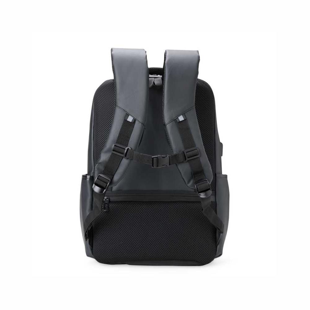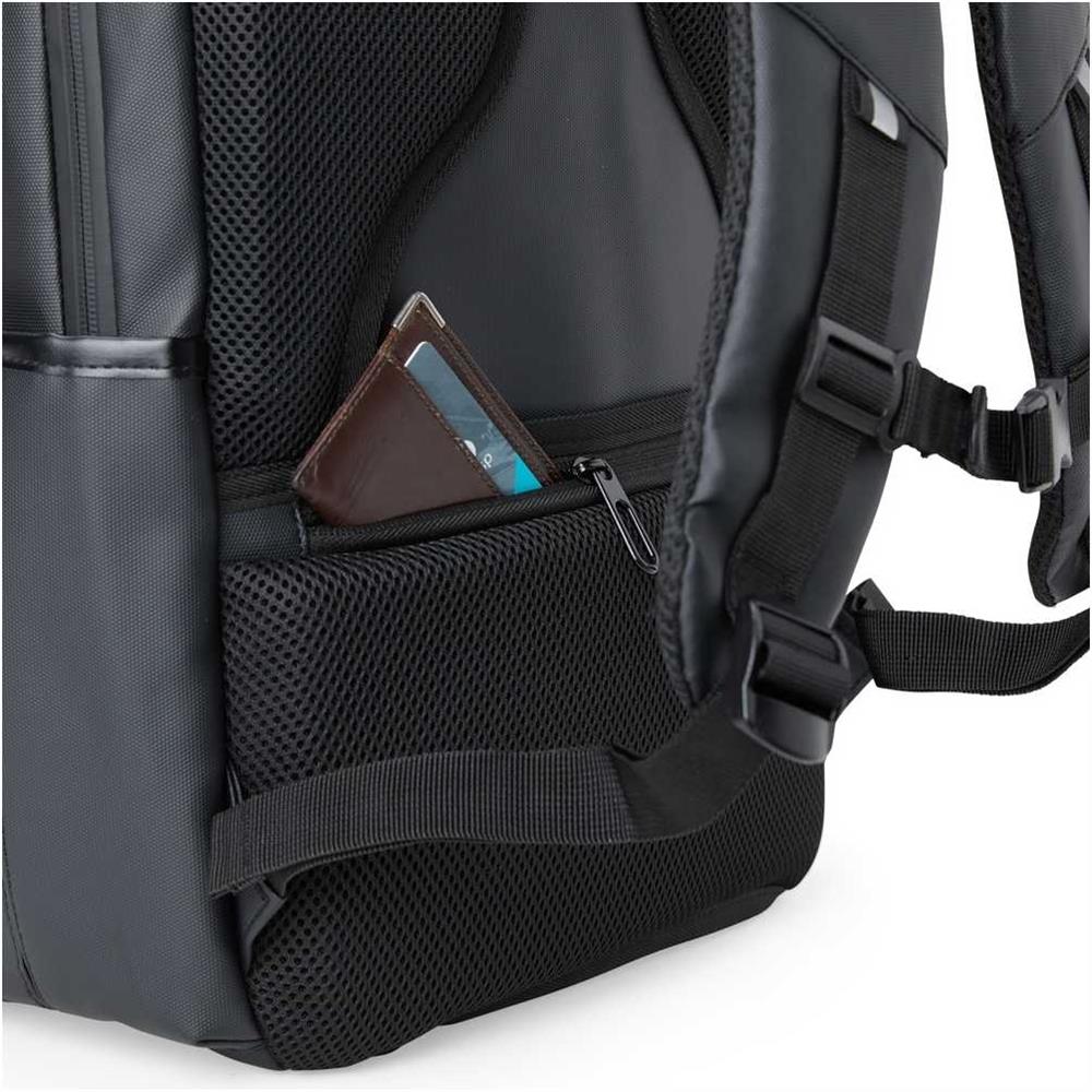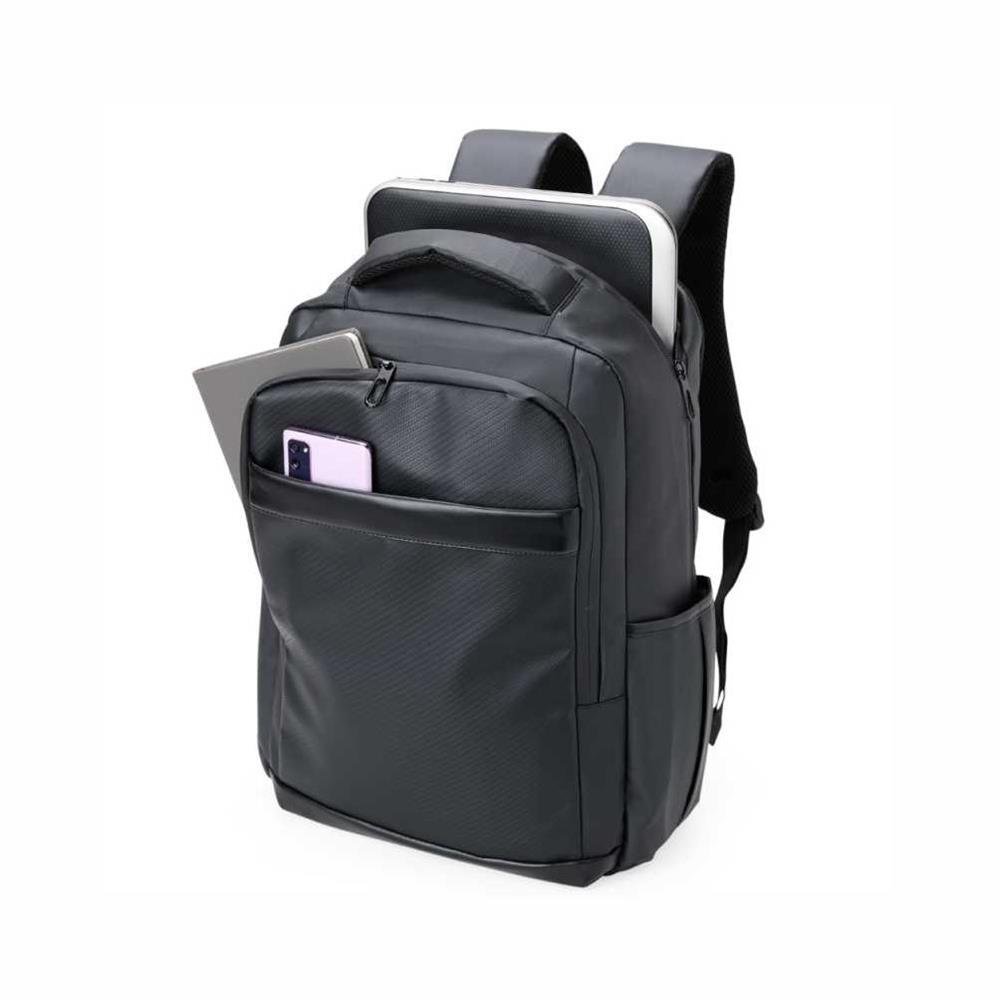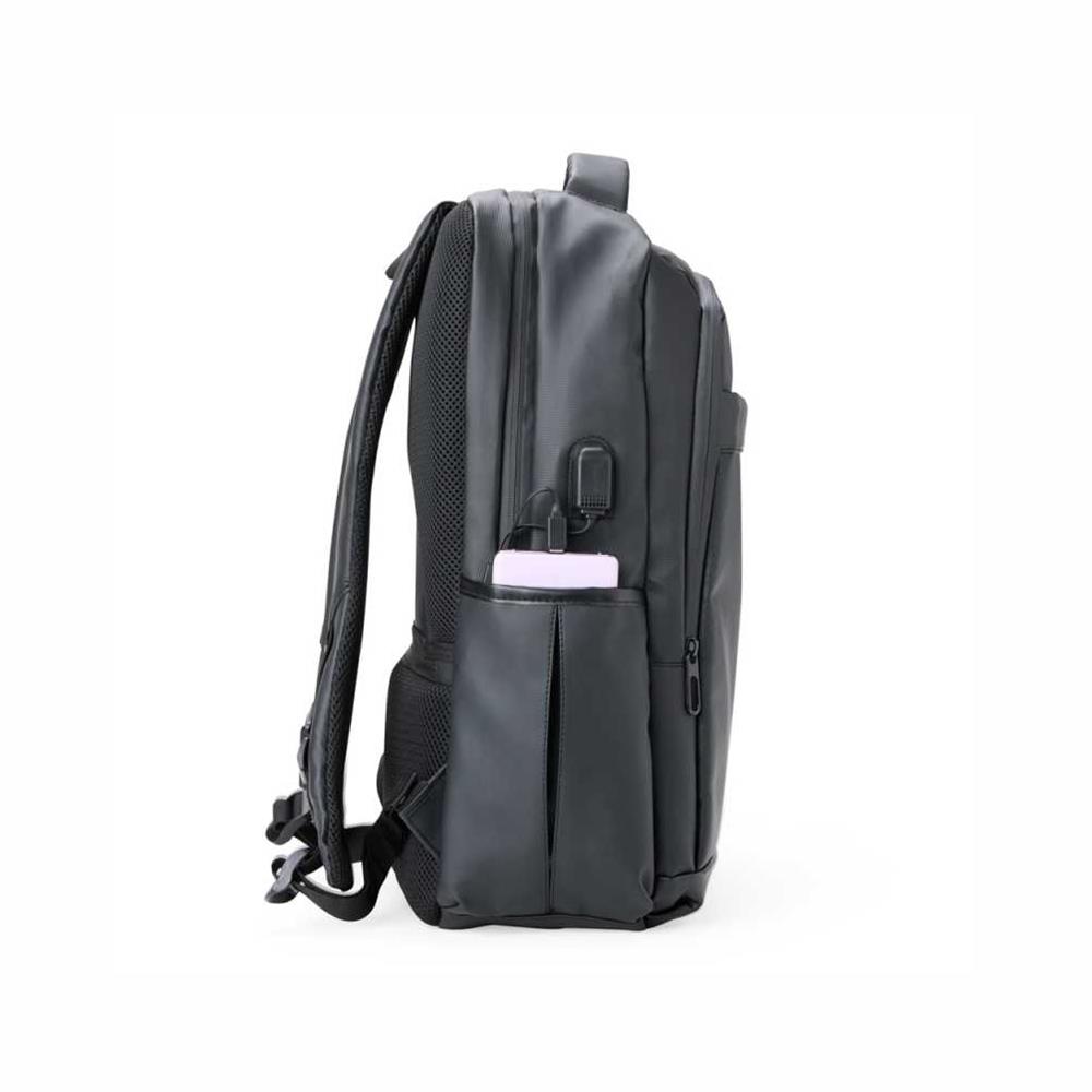Nossa mochila de 21 litros combina funcionalidade e conforto! Feita em couro sintético resistente à água e com design inteligente, é perfeita para impressionar no mundo corporativo. Conta com quatro compartimentos estratégicos: um frontal, outro com bolsos e divisórias para documentos e canetas, um compartimento antifurto para proteger os itens mais valiosos e um principal, com espaço para notebooks de até 15,6" e entrada para cabo USB. Além disso, possui plaquinha para personalização exclusiva, dois bolsos laterais, alças reguláveis e acolchoadas que distribuem o peso de forma equilibrada, acabamentos refletivos e uma parte traseira acolchoada, garantindo mais conforto. Para completar, conta com engate para malas de viagem, sendo a parceira ideal além do dia a dia do trabalho. Acompanha plaquinha metálica personalizável.