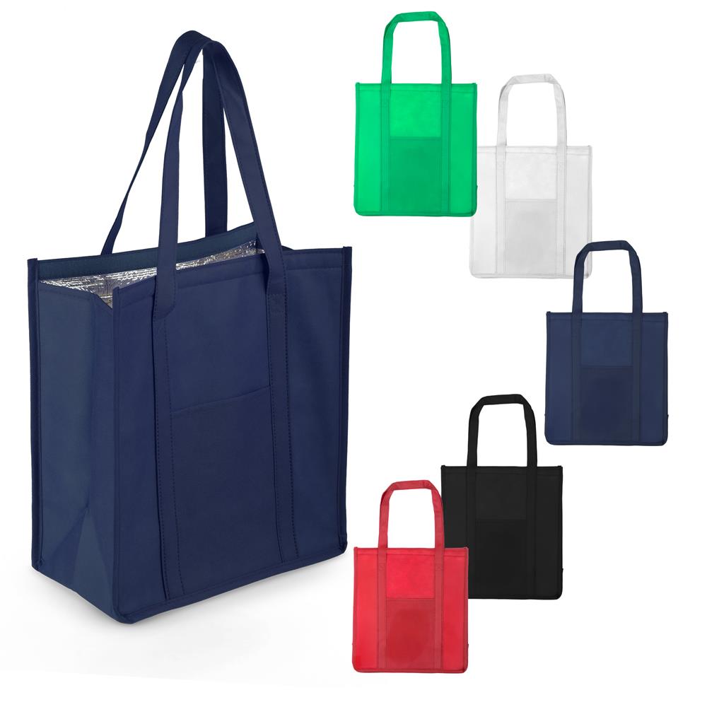 Sacola térmica em TNT com 80g/m², interior costurado revestido em algodão e folha de alumínio de 2mm. Possui alça com 50cm de ponta a ponta. Conta com um bolso frontal e fêcho em velcro.