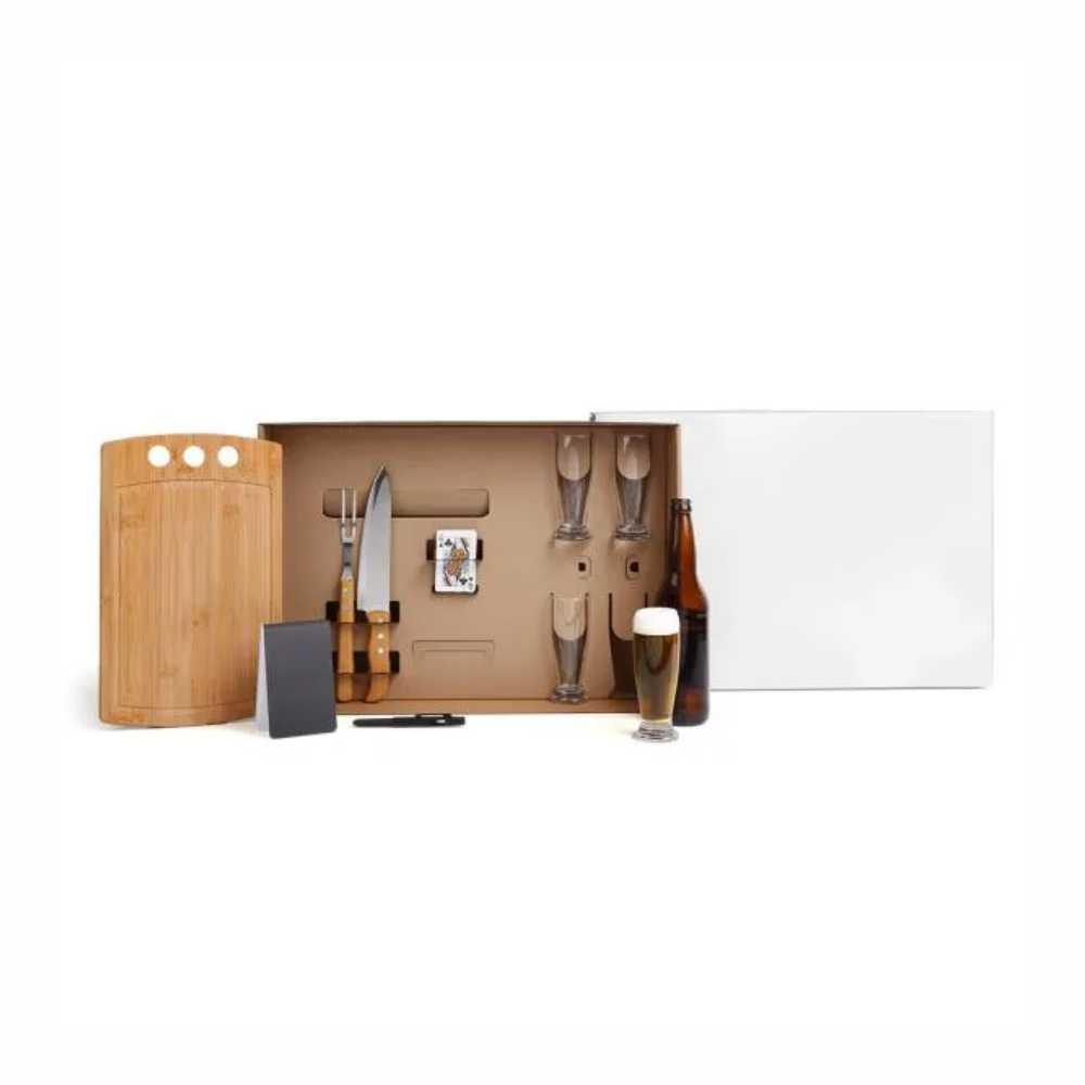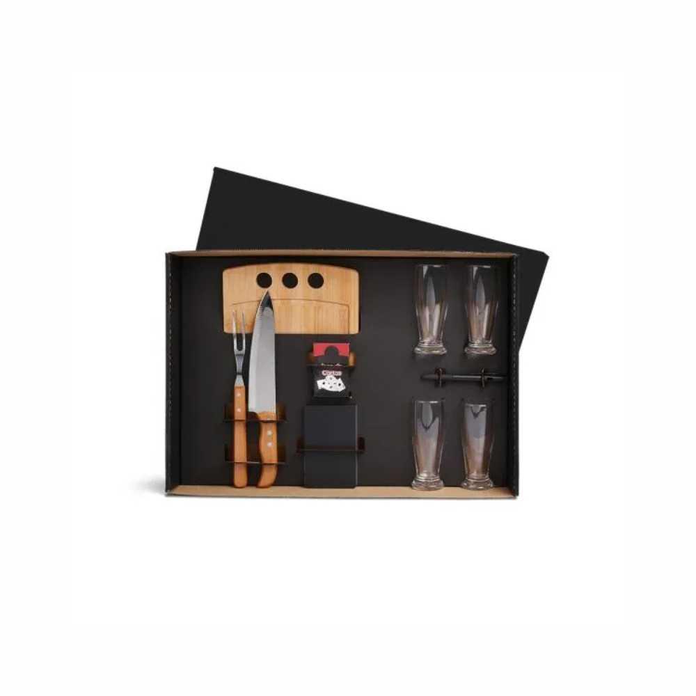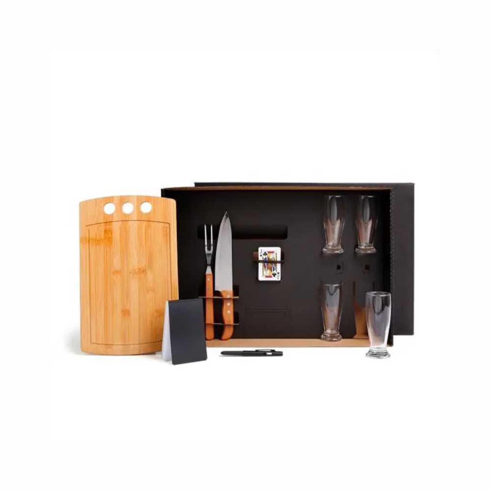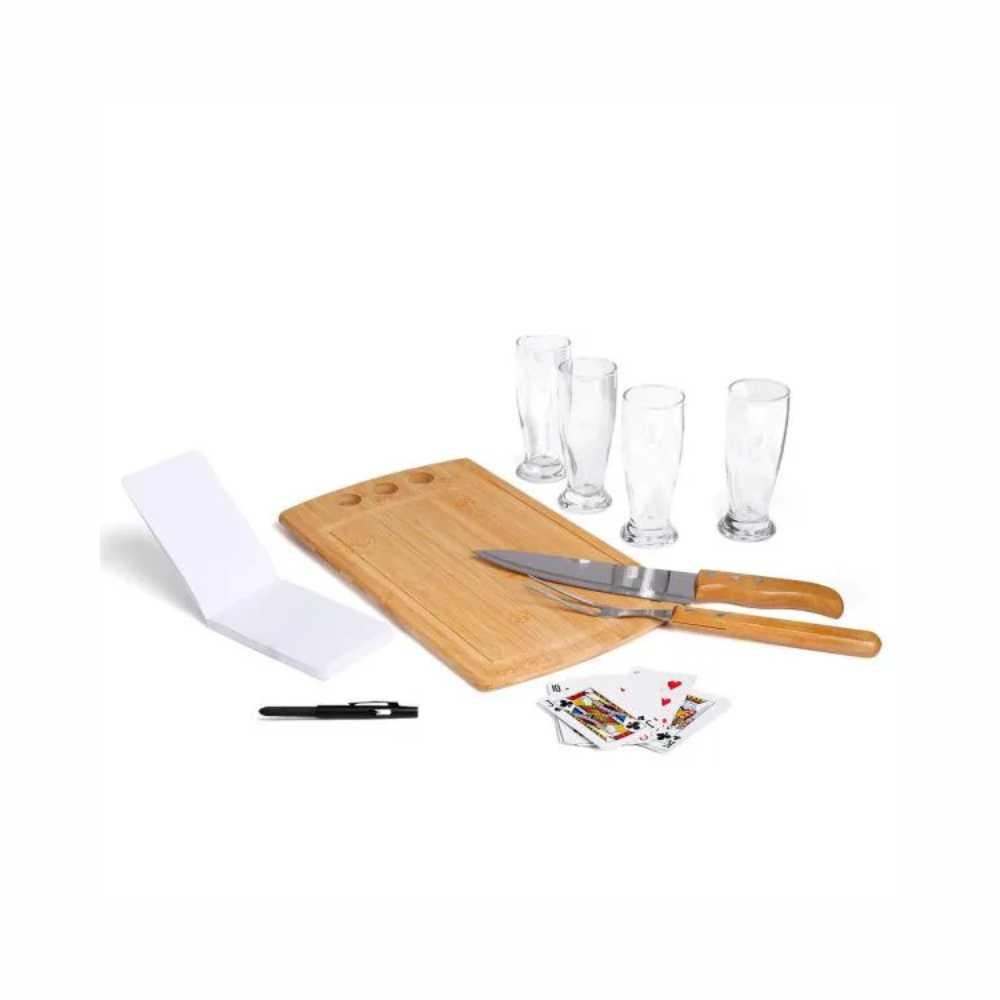 Kit para Churrasco, Cerveja e Truco. Composto por tábua com três furos em Bambu; garfo trinchante e faca 8" em Madeira/Inox; quatro copos de cerveja em vidro; bloco de anotações; caneta esferográfica e jogo de cartas.
