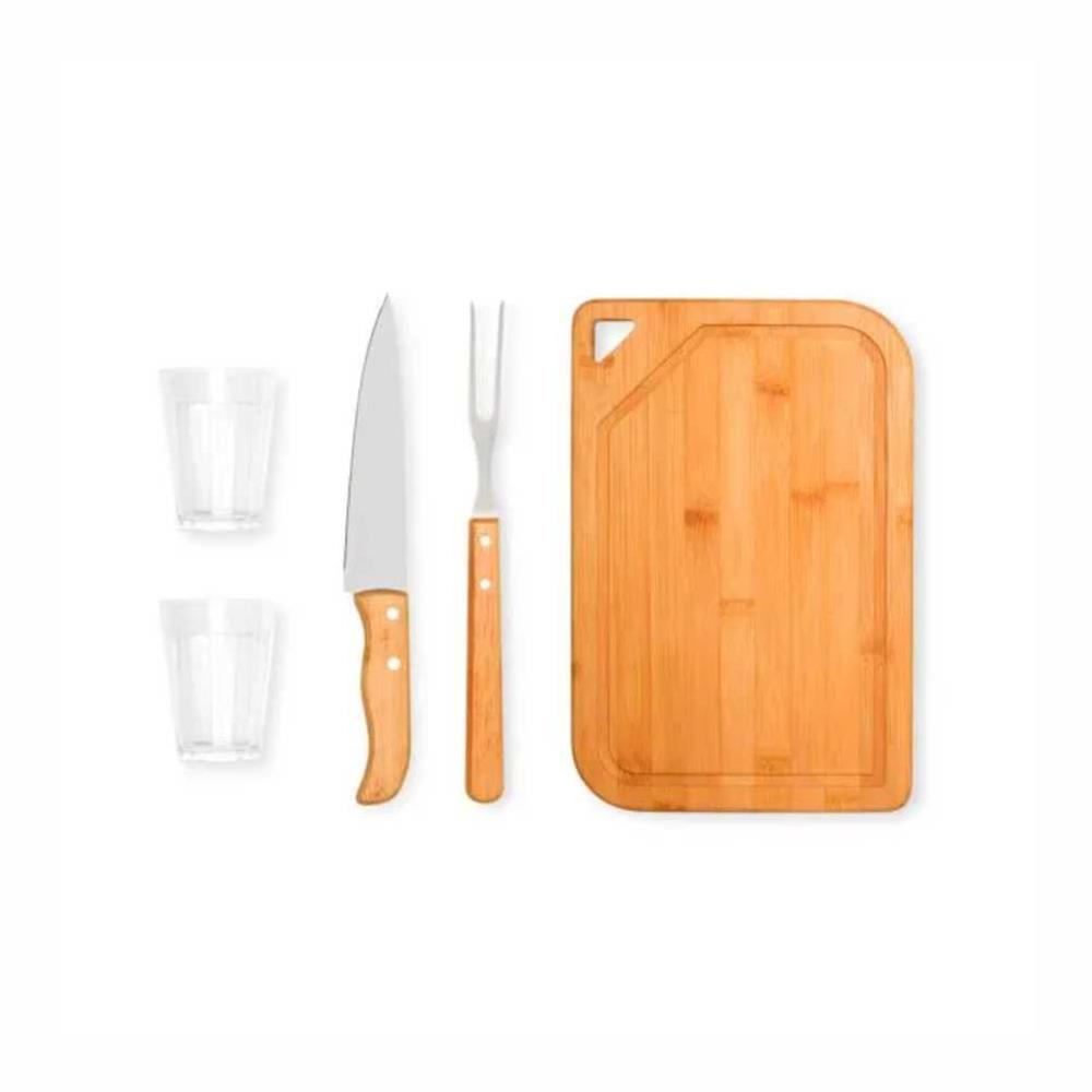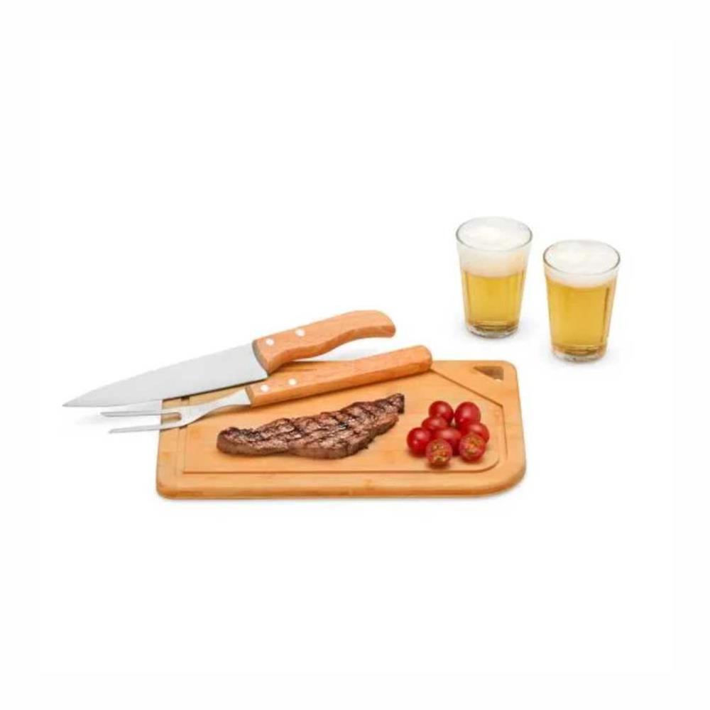 Kit para Churrasco. Composto por tábua em Bambu; dois copos americanos em vidro; faca 7" e garfo em Madeira/Inox Como cortesia, na faca 7" fazemos uma gravação com os cortes do boi.