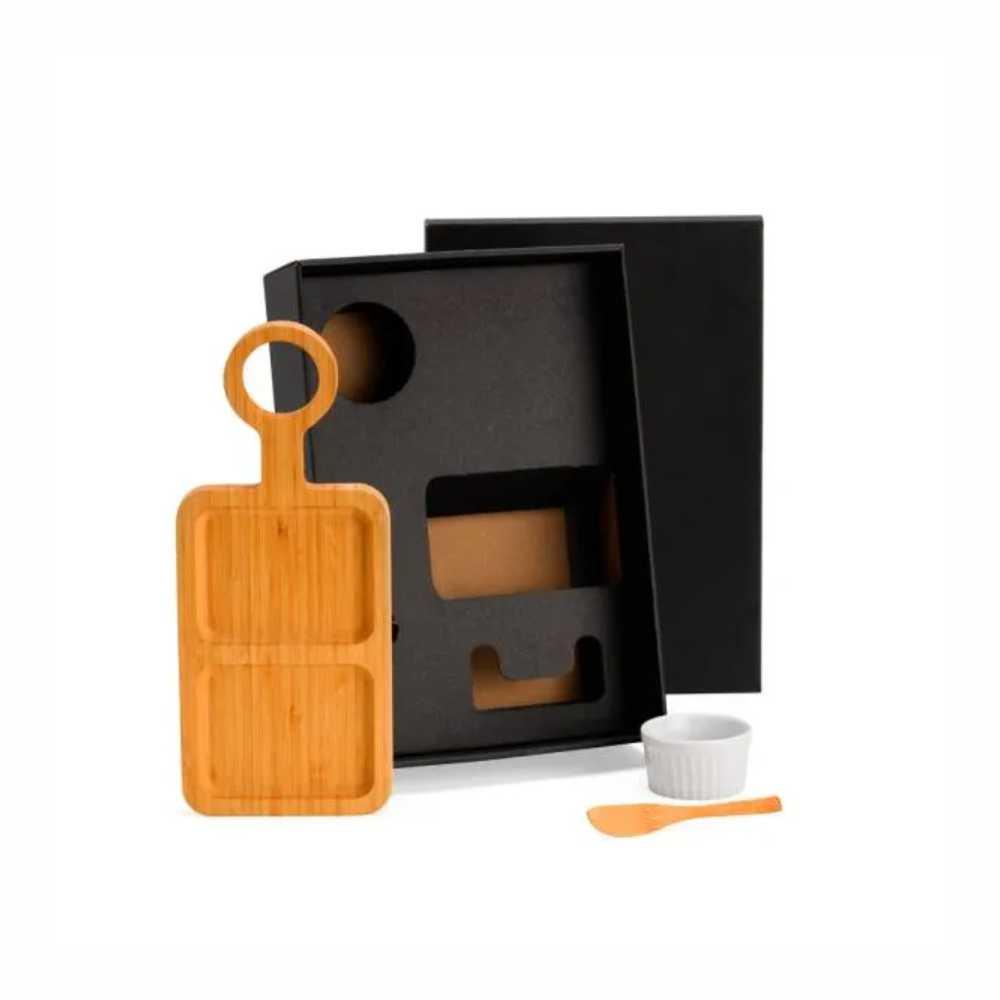 Kit para petisco com petisqueira confeccionada em Bambu, com pegador funcional que serve como alça; ramekin em plástico PP e uma espátula de 14 cm em Bambu