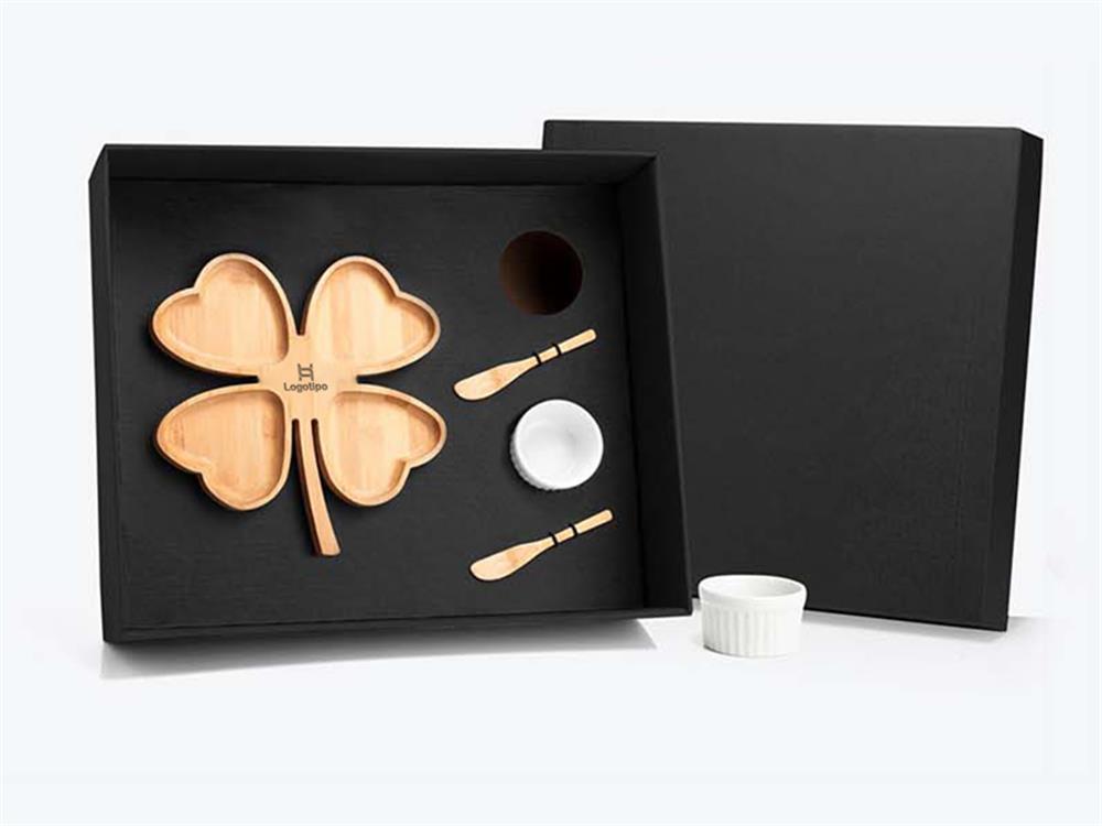 Kit para petisco com petisqueira formato de trevo, duas espátulas em bambu e dois ramekins em porcelana. Estão perfeitamente acomodados em uma caixa para presentear.
